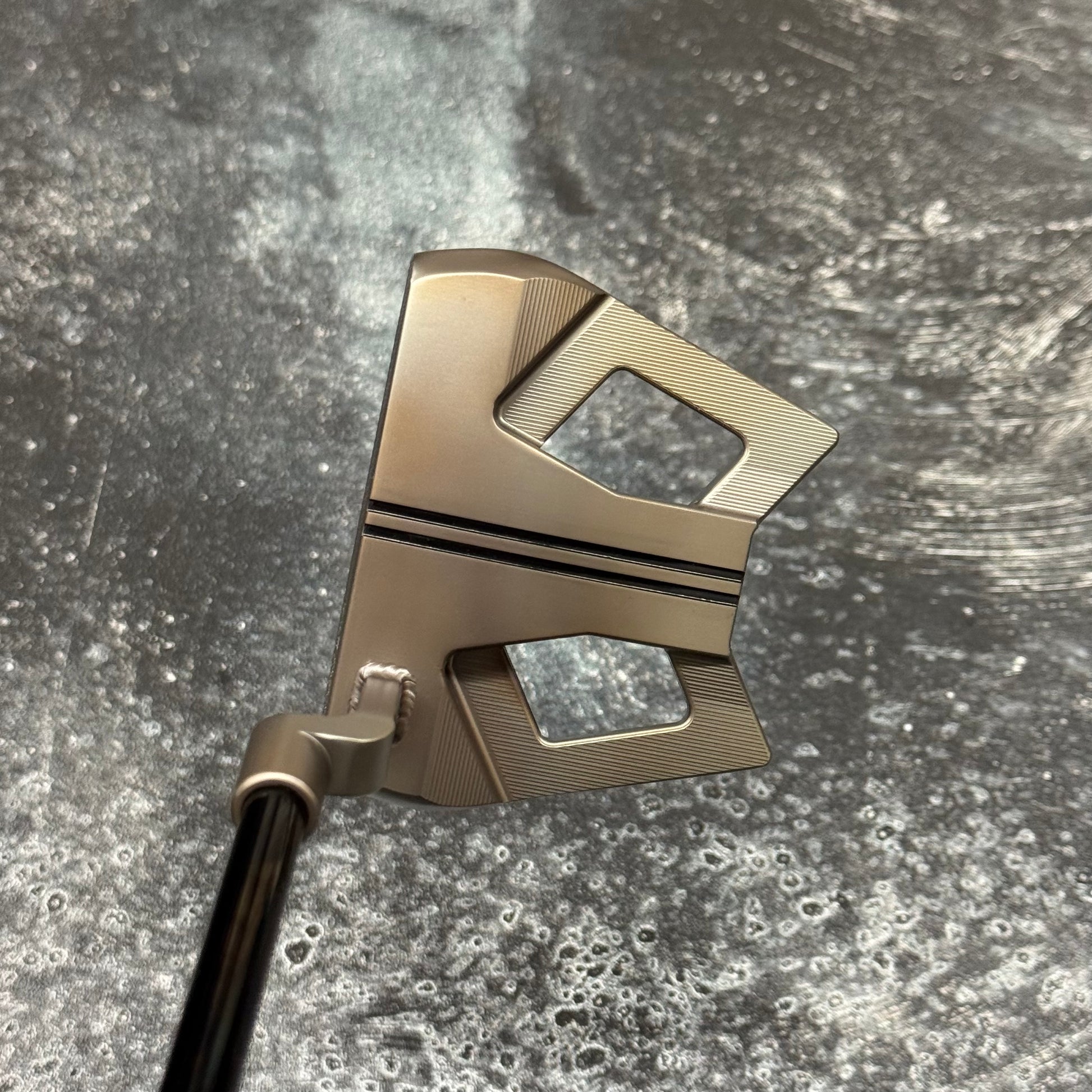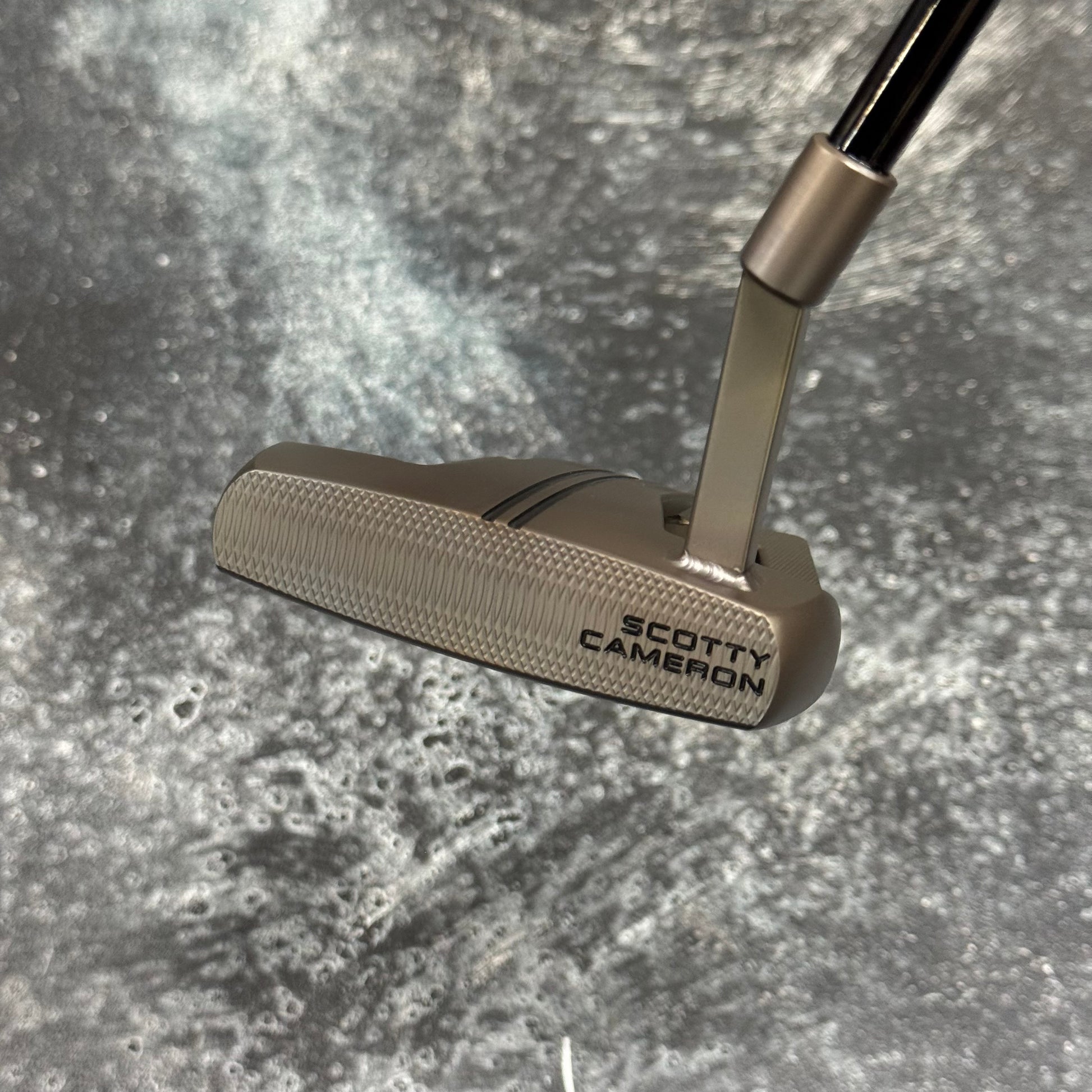 Scotty Cameron Phantom 9 with a welded plumbers neck. Finished in our Rustic torched finish with a Black Anodized sole plate and a smoke Black shaft!