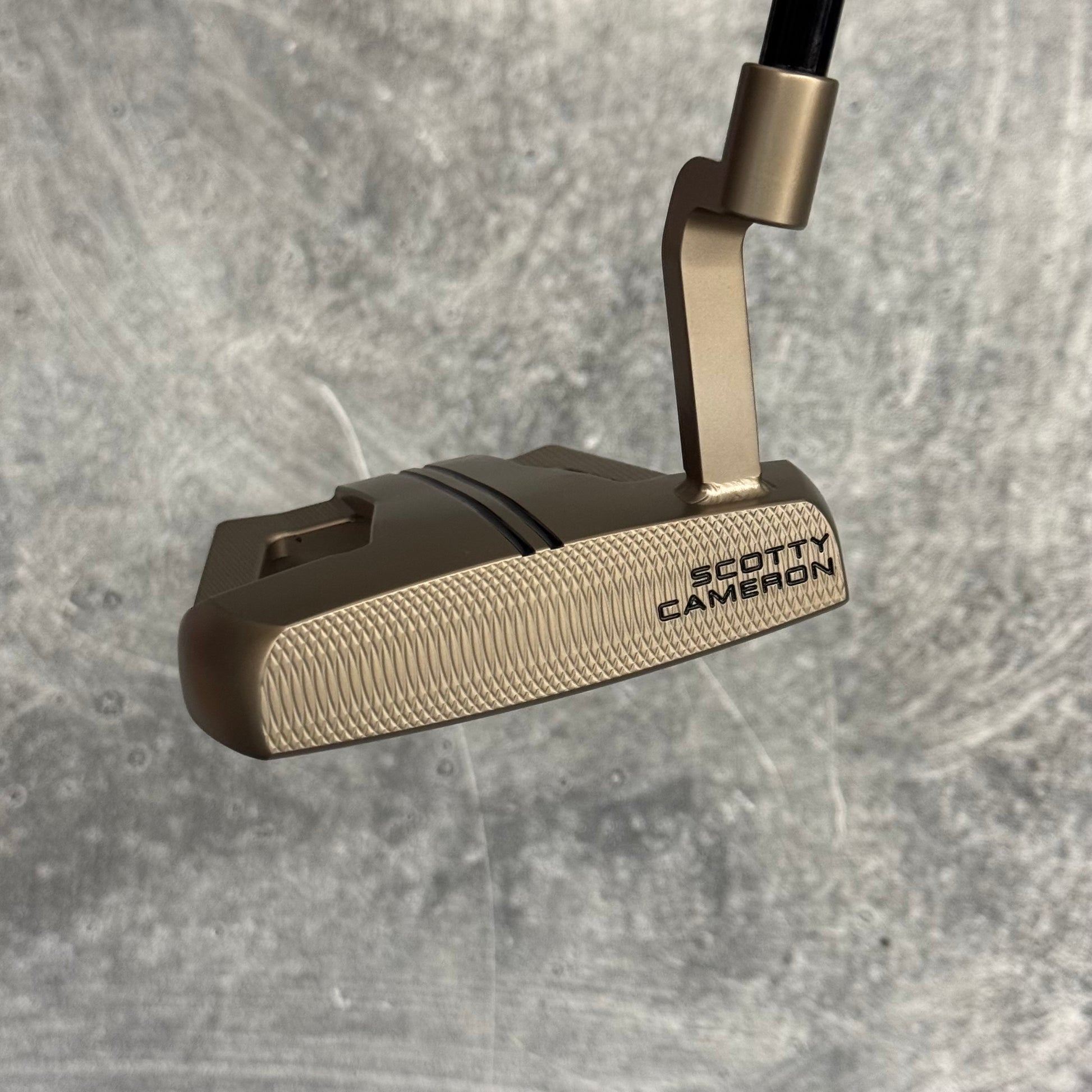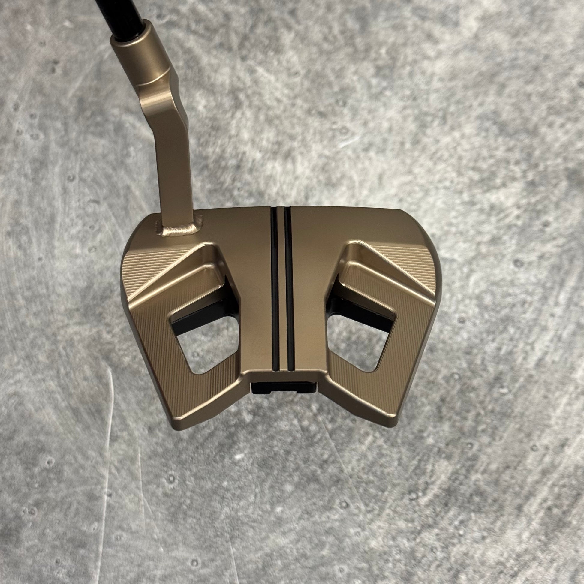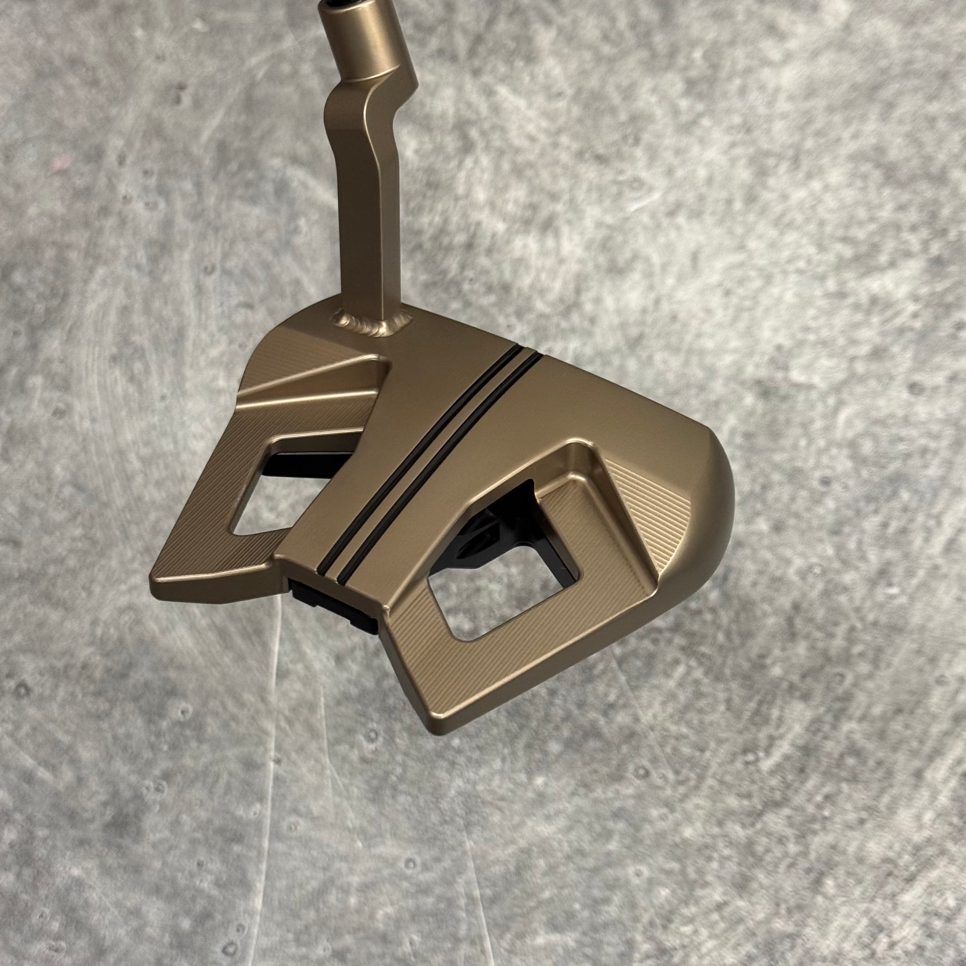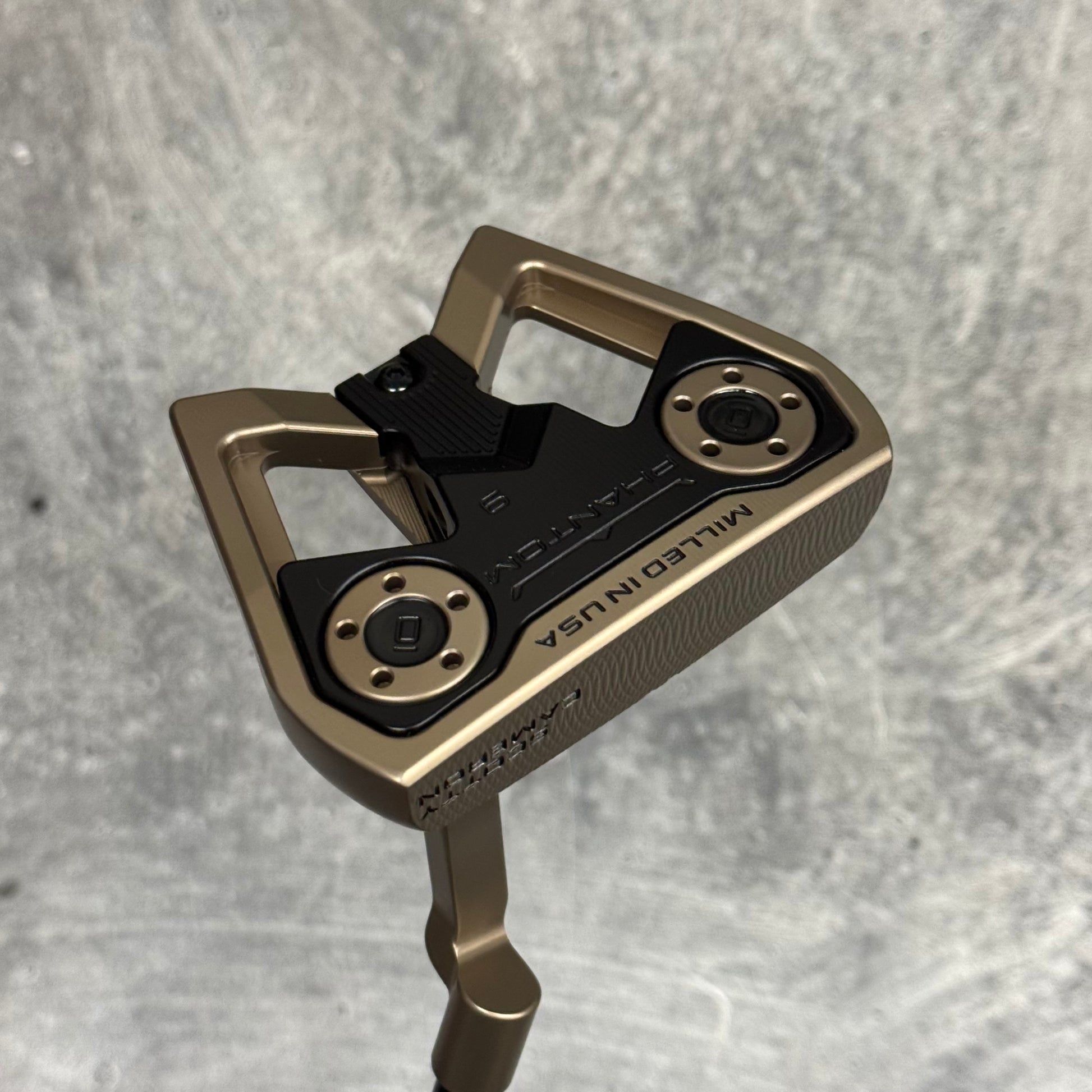 Scotty Cameron Phantom 9 with a welded plumbers neck. Finished in our Chromatic Bronze torched finish with a Black Anodized sole plate and a smoke Black shaft!