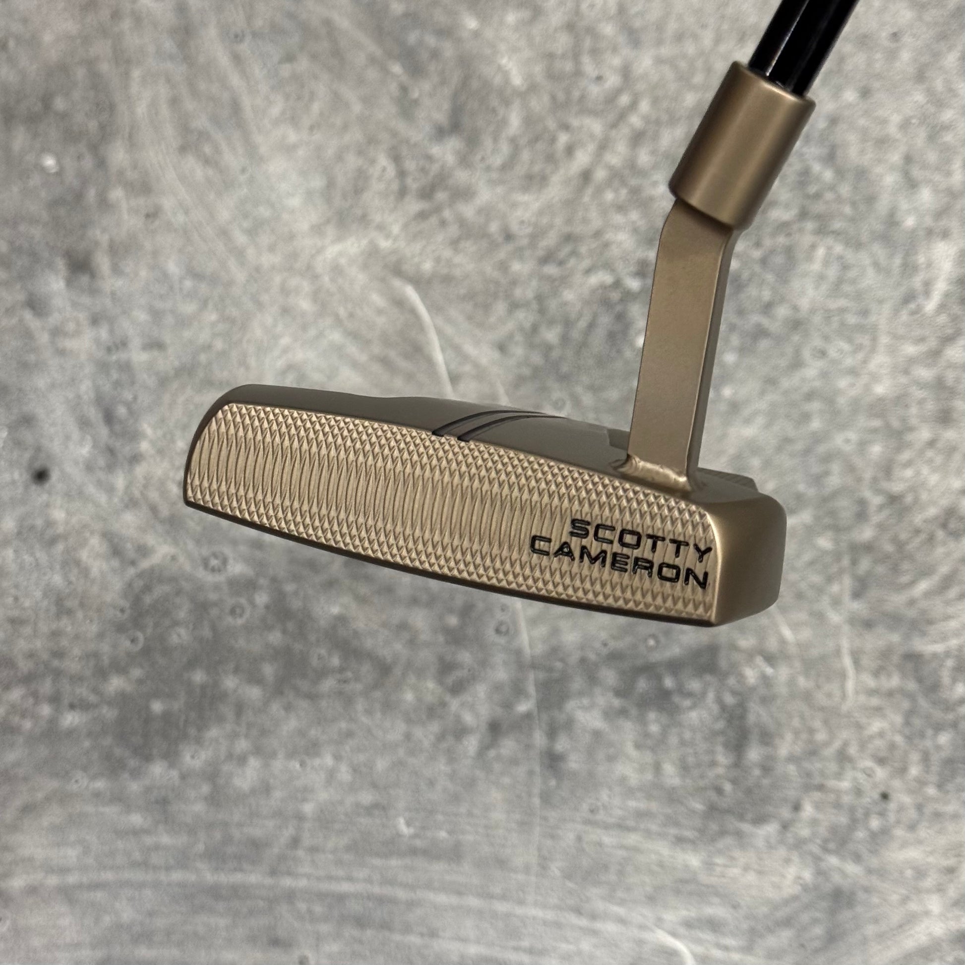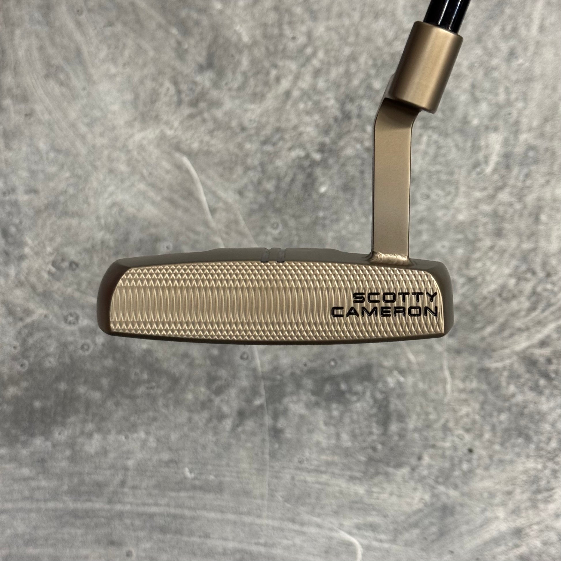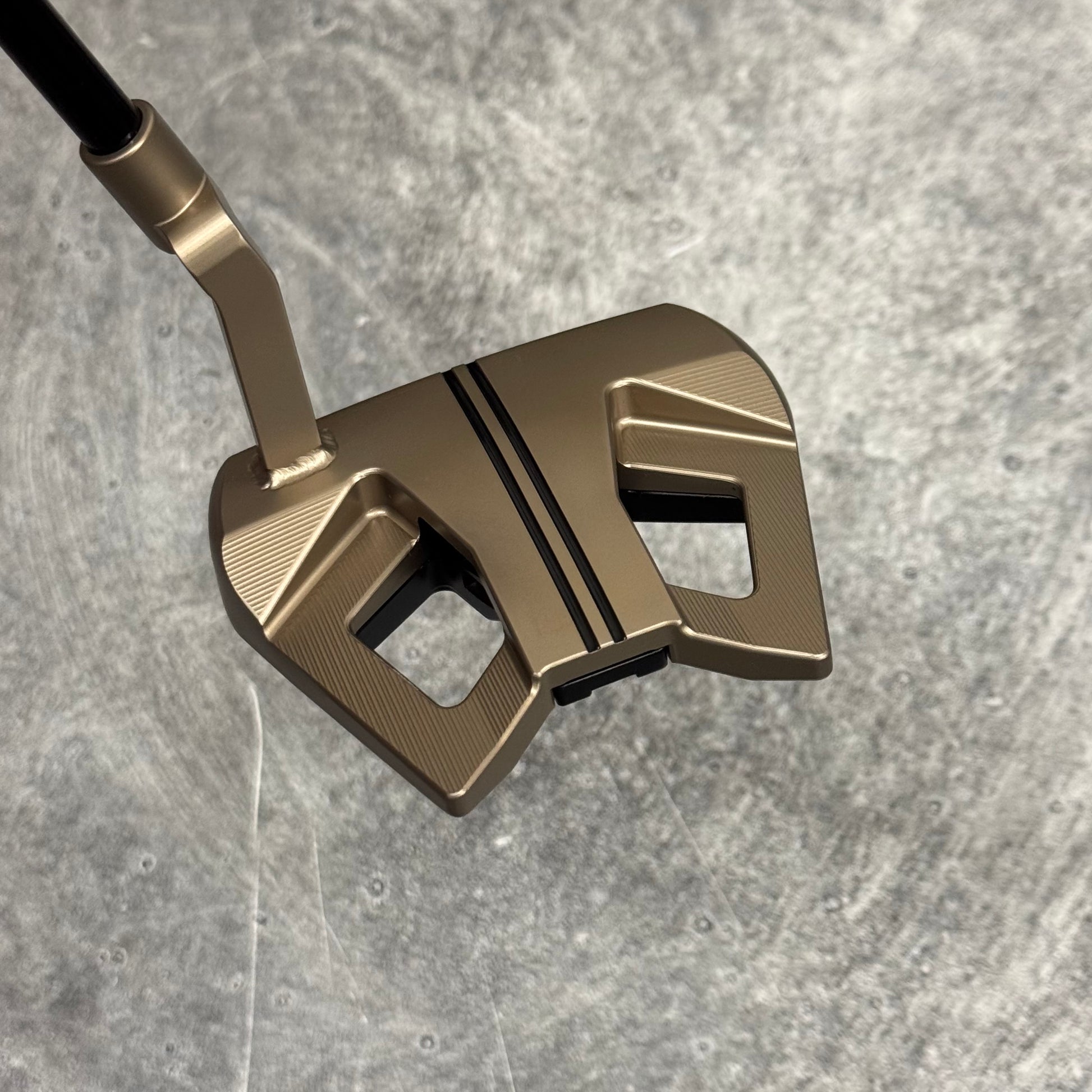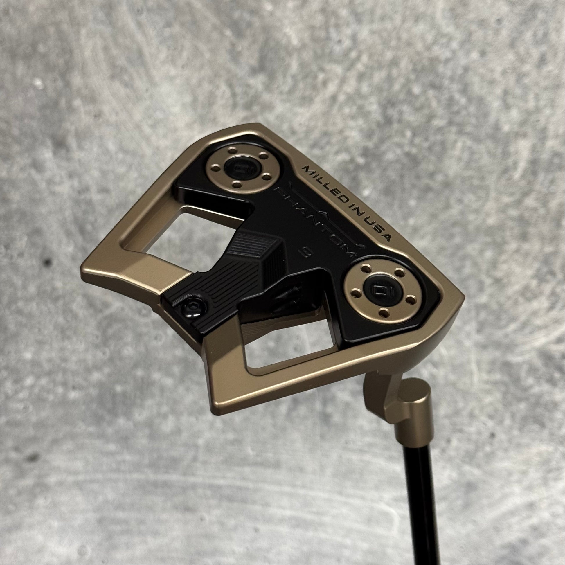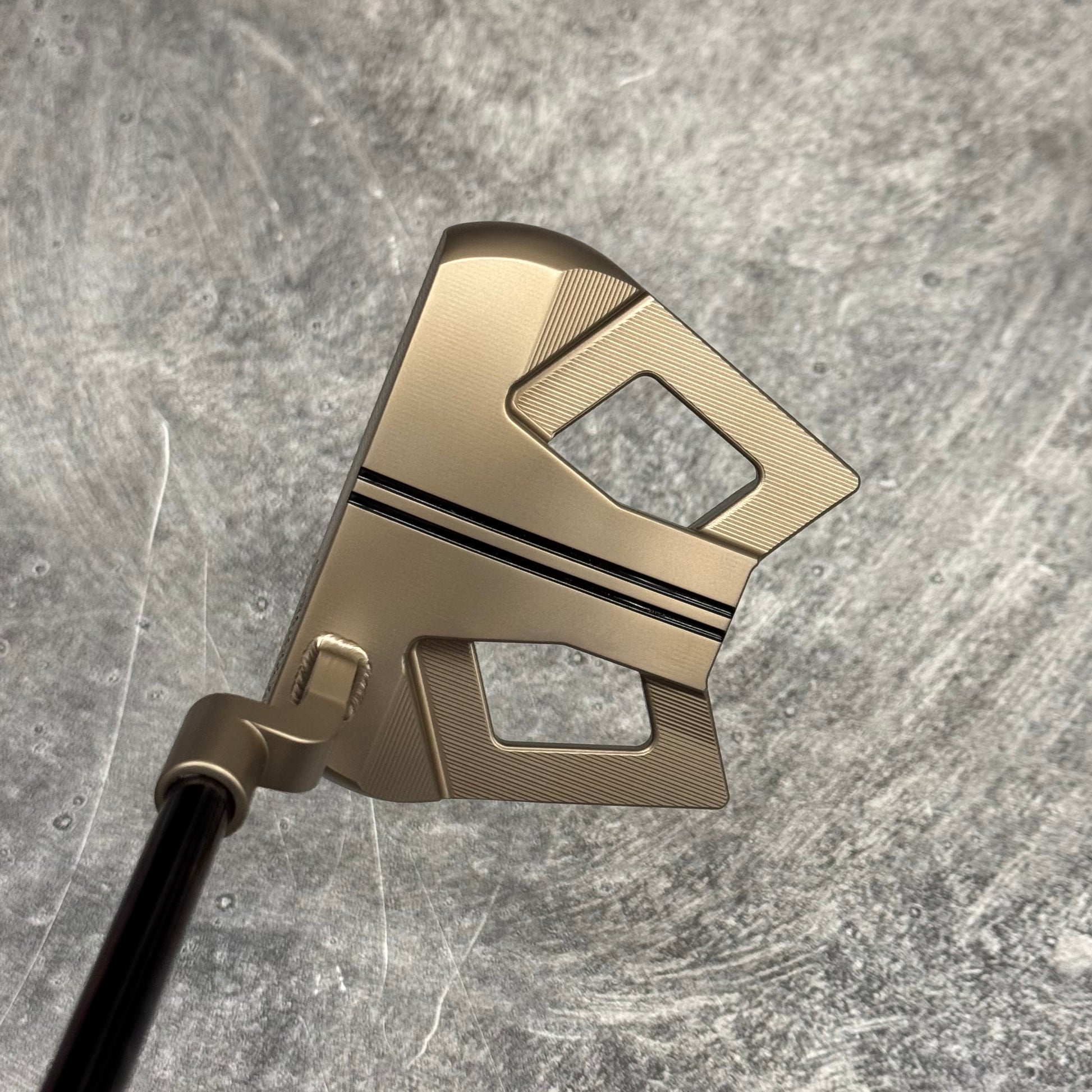 Scotty Cameron Phantom 9 with a welded plumbers neck. Finished in our Chromatic Bronze torched finish with a Black Anodized sole plate and a smoke Black shaft!