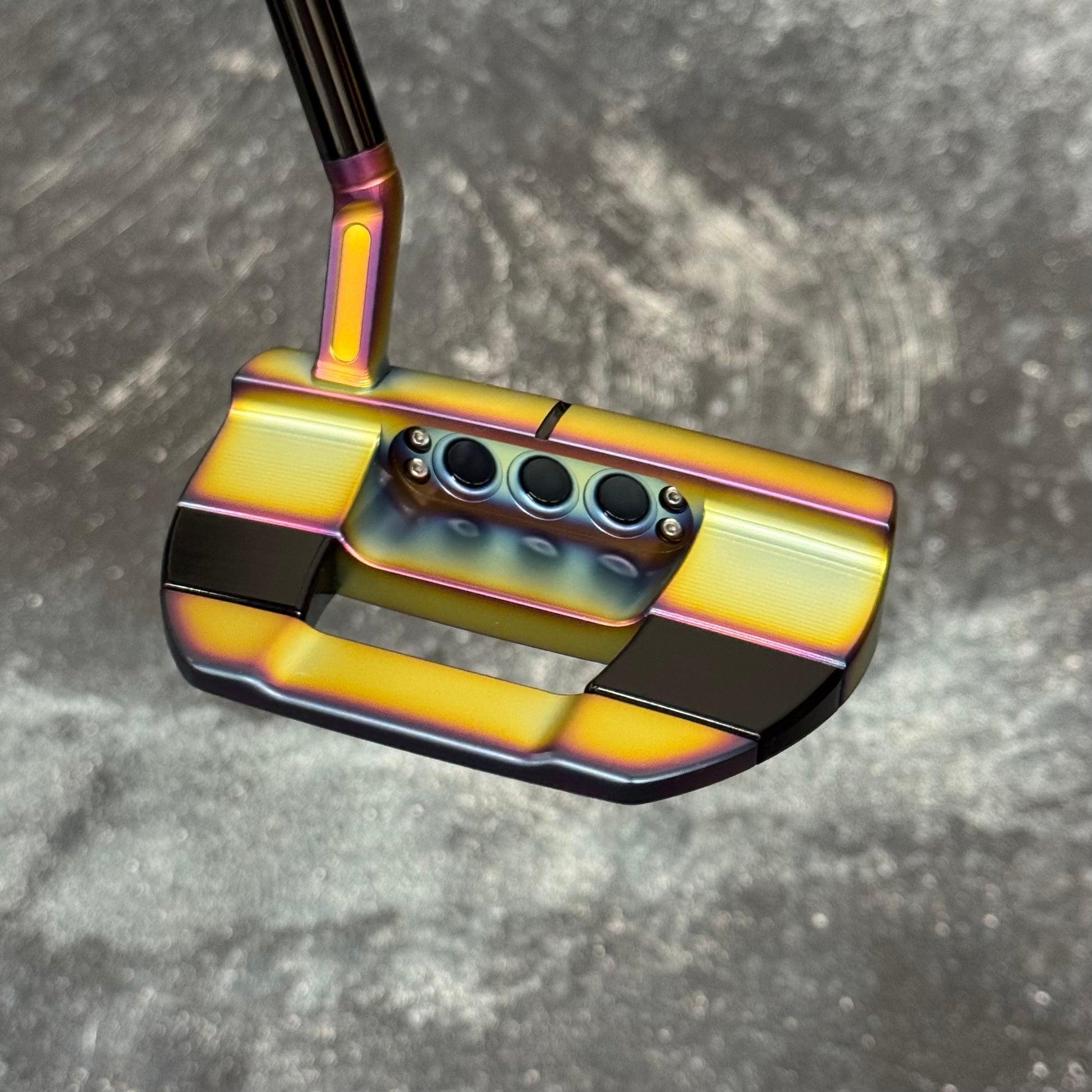 Scotty Cameron Studio Style Fastback 1.5 in our Crazy Rainbow PVD with a Nickel Chain Link Milled Face Insert, Black PVD weights and a Black Anodized sole plate. Comes with a Smoke Black shaft!