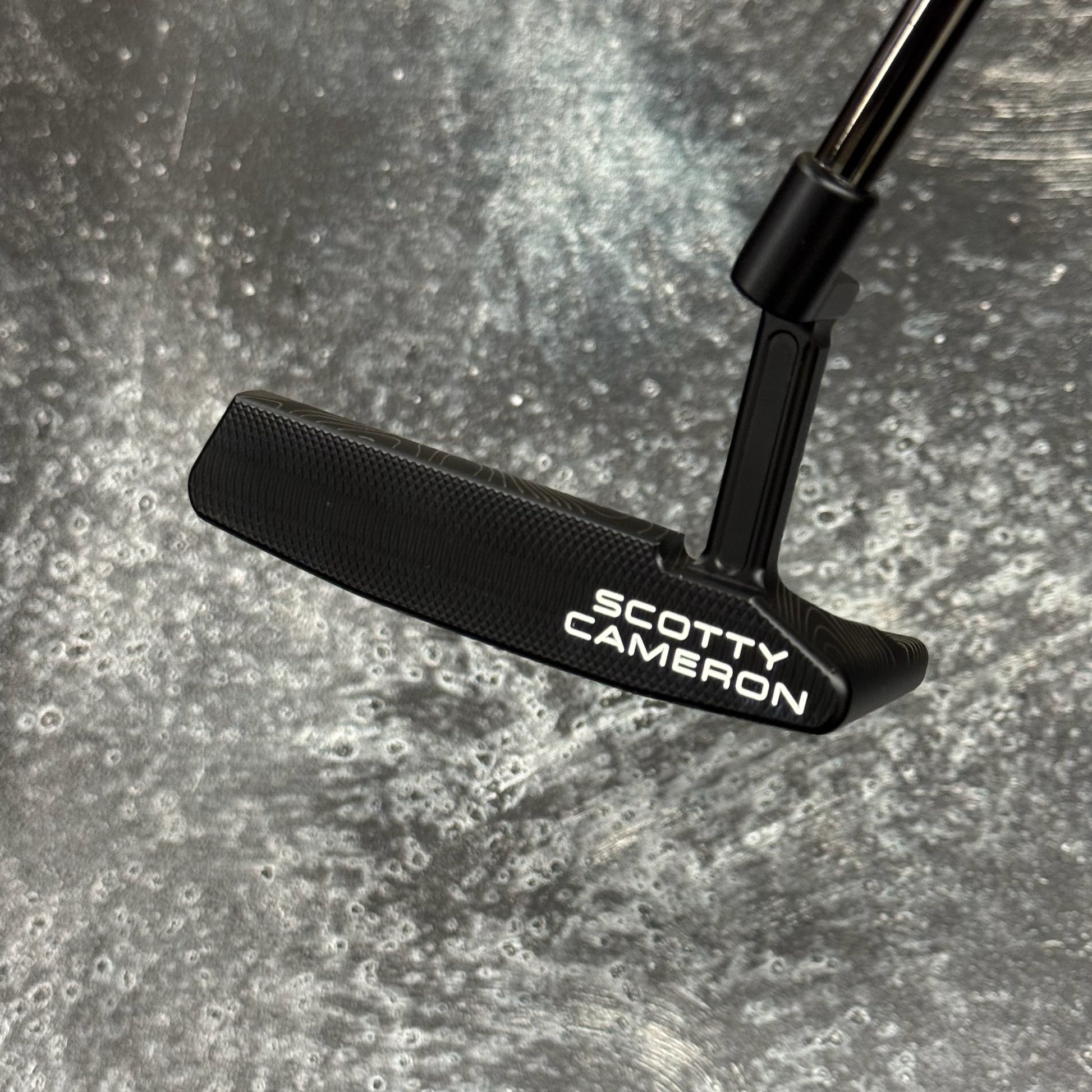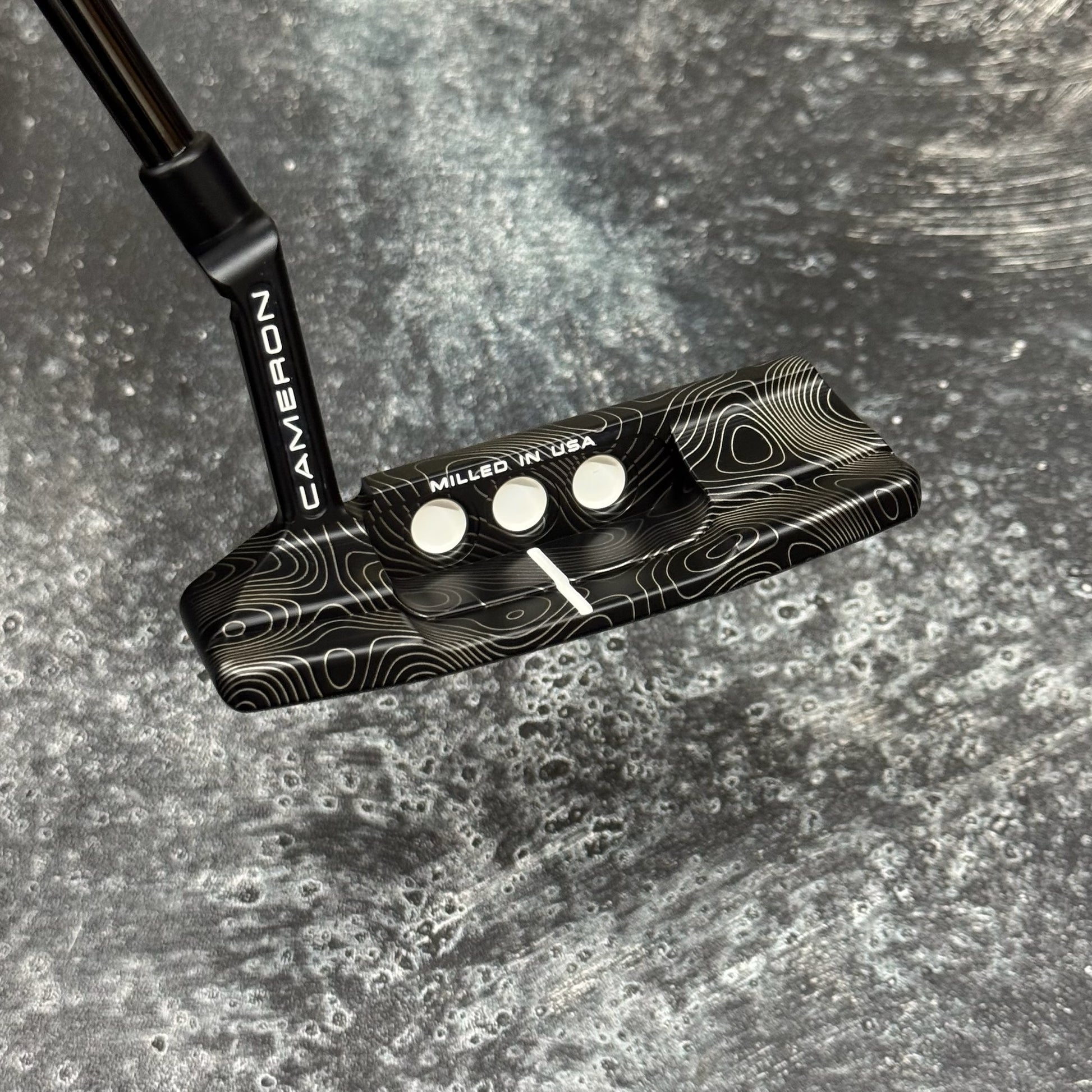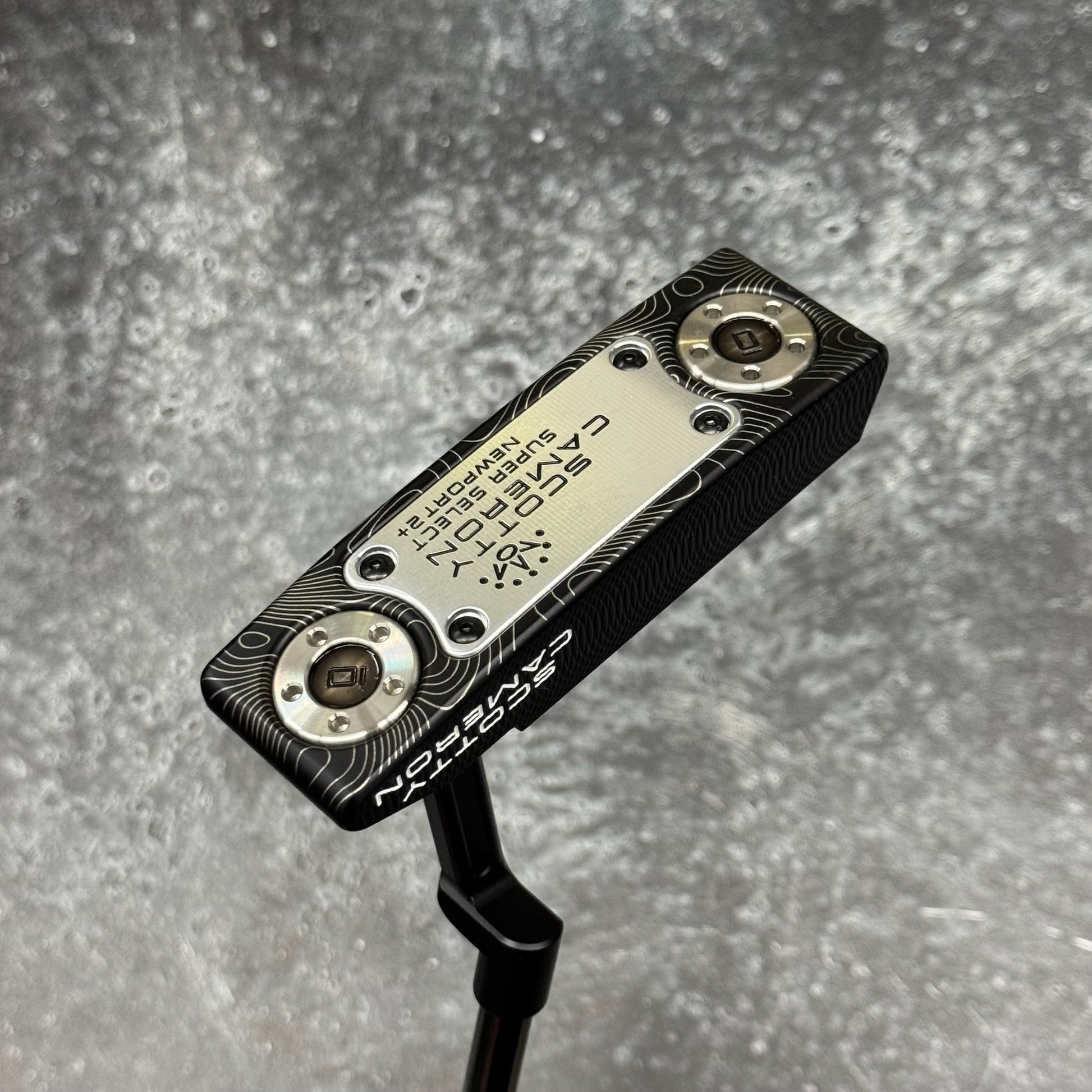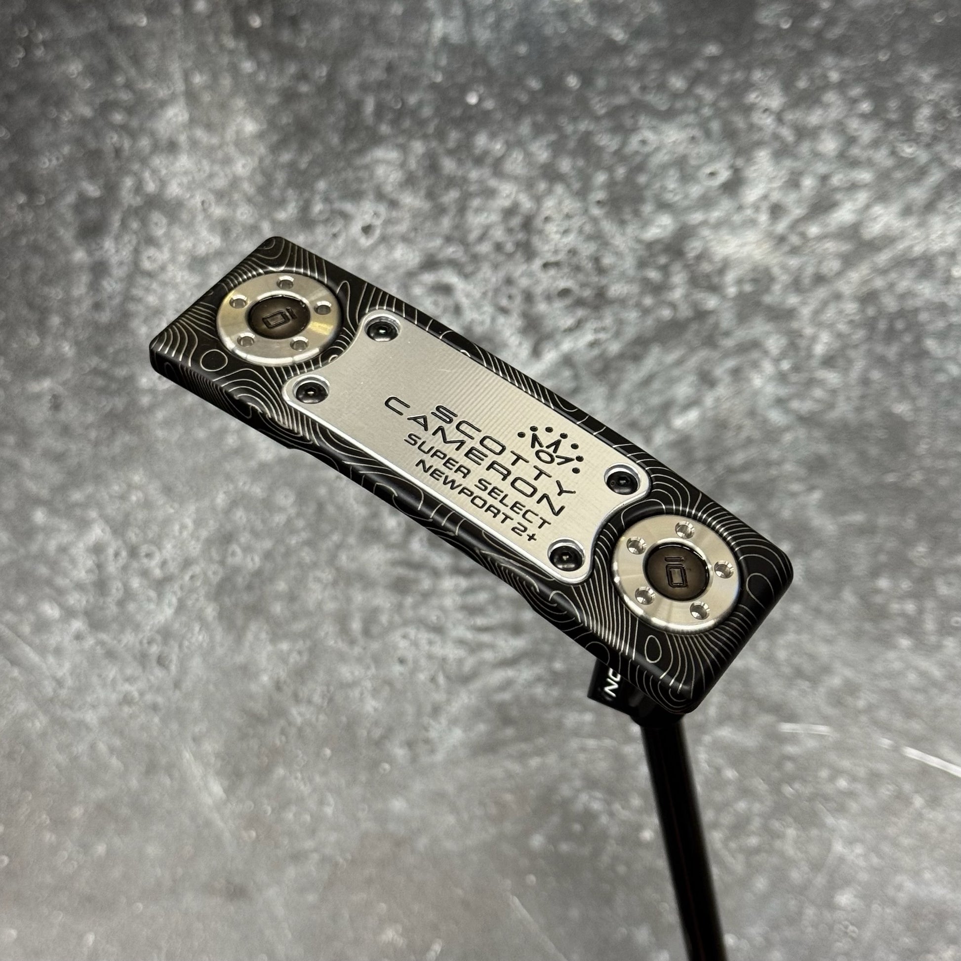 Scotty Cameron Super Select Newport 2+ in our Black PVD finish and Contour Print. Silver sole plate and Translucent Black Paint fill!