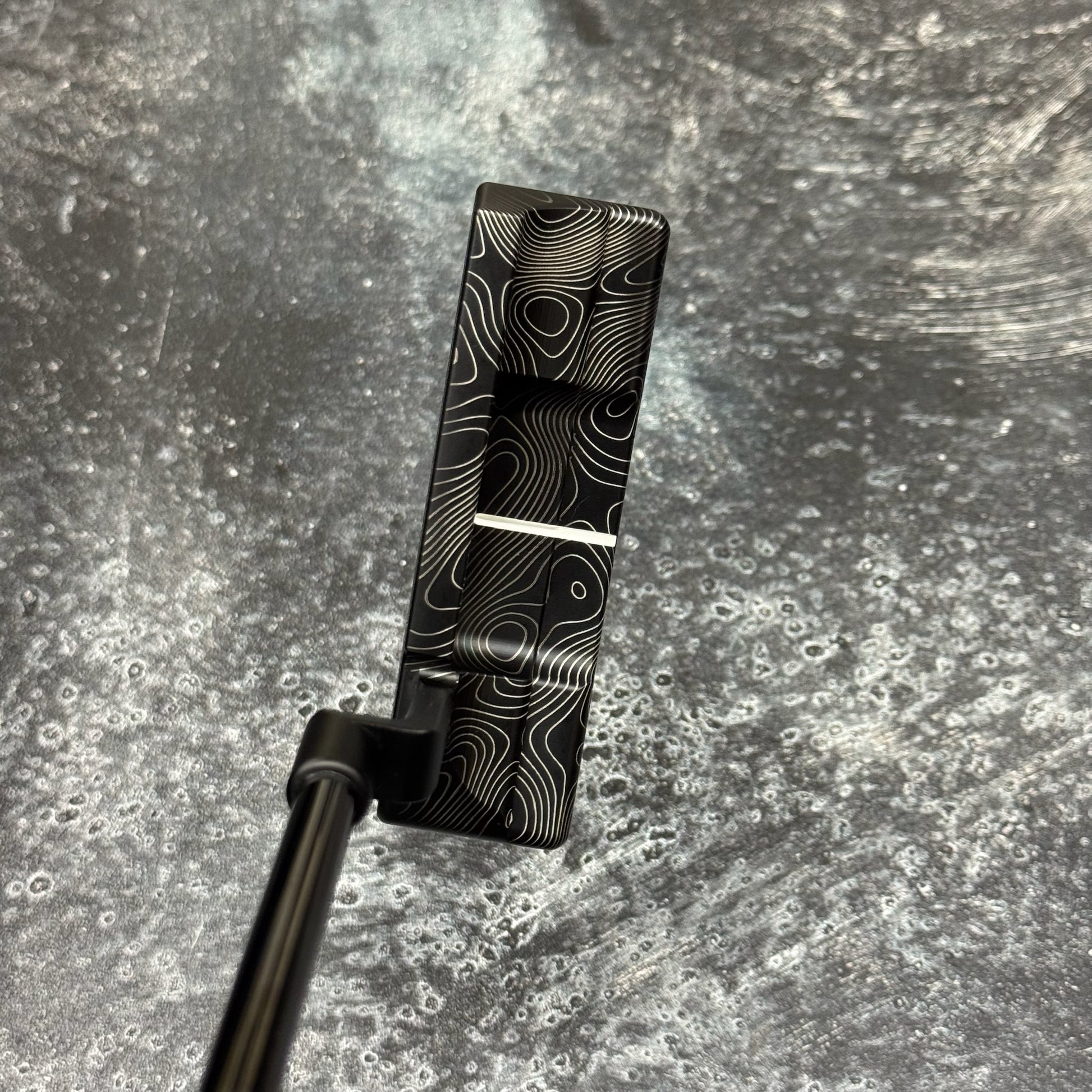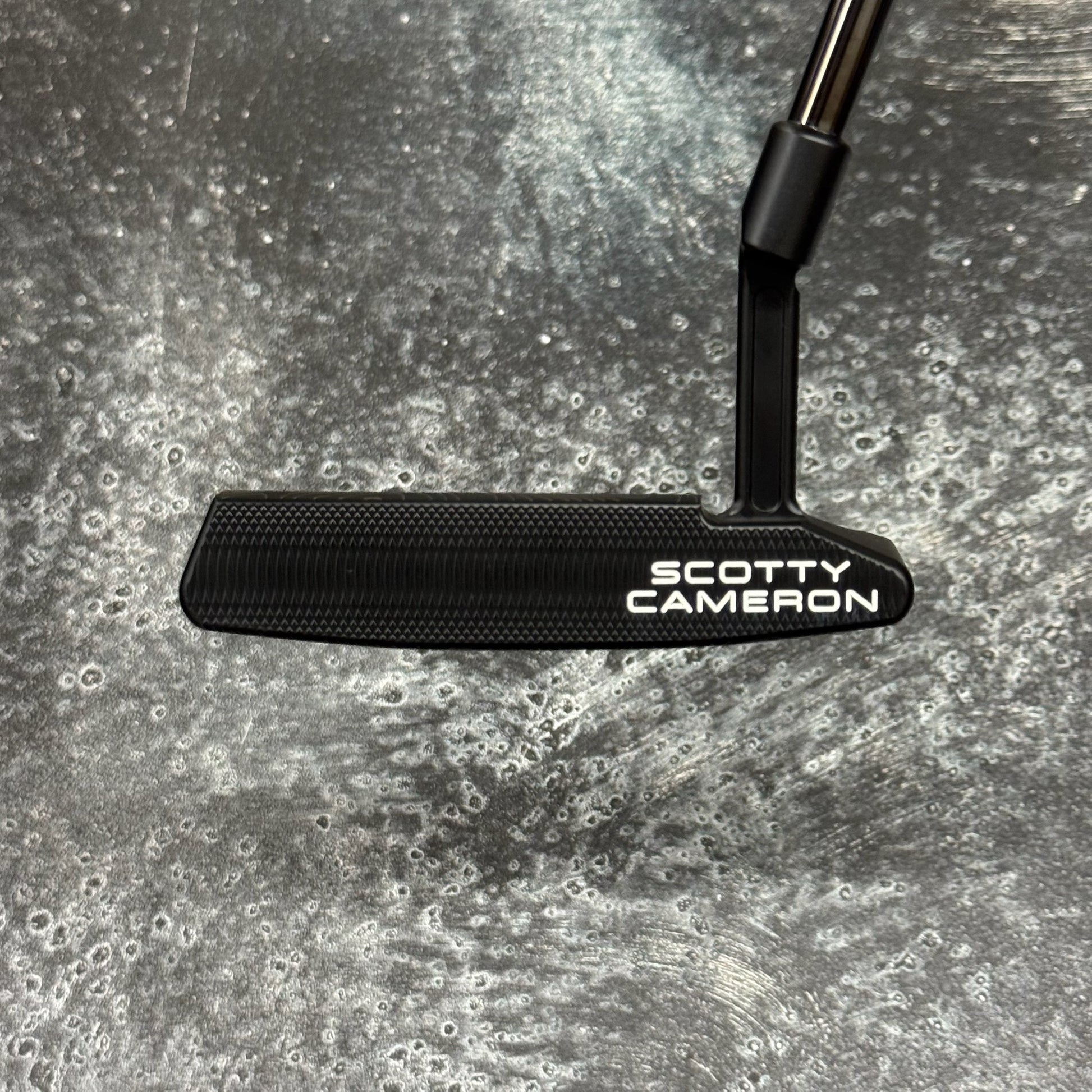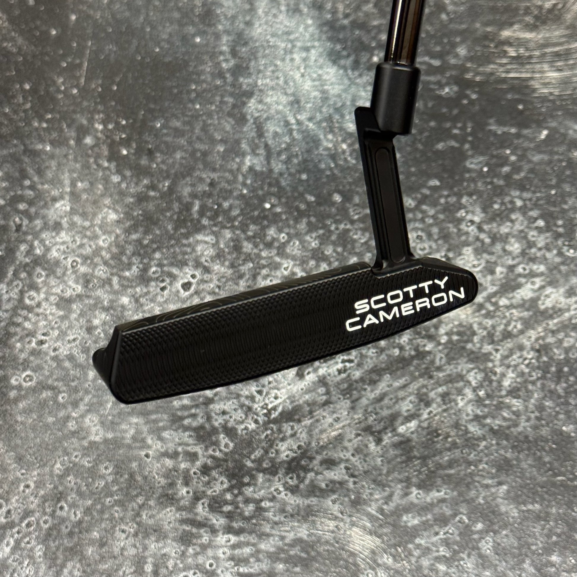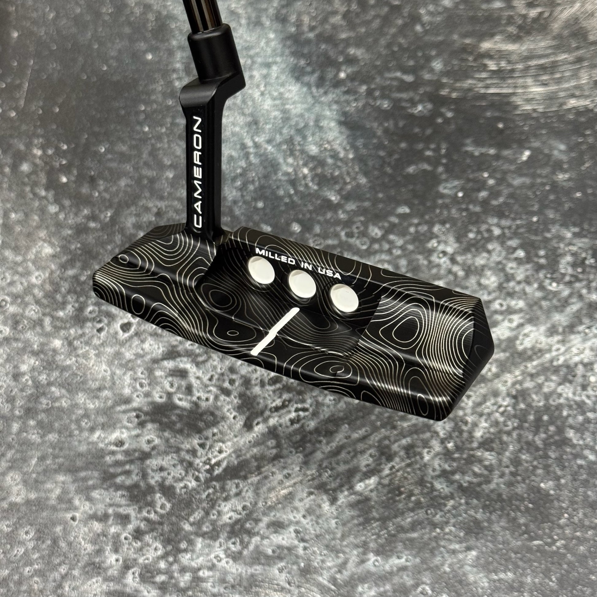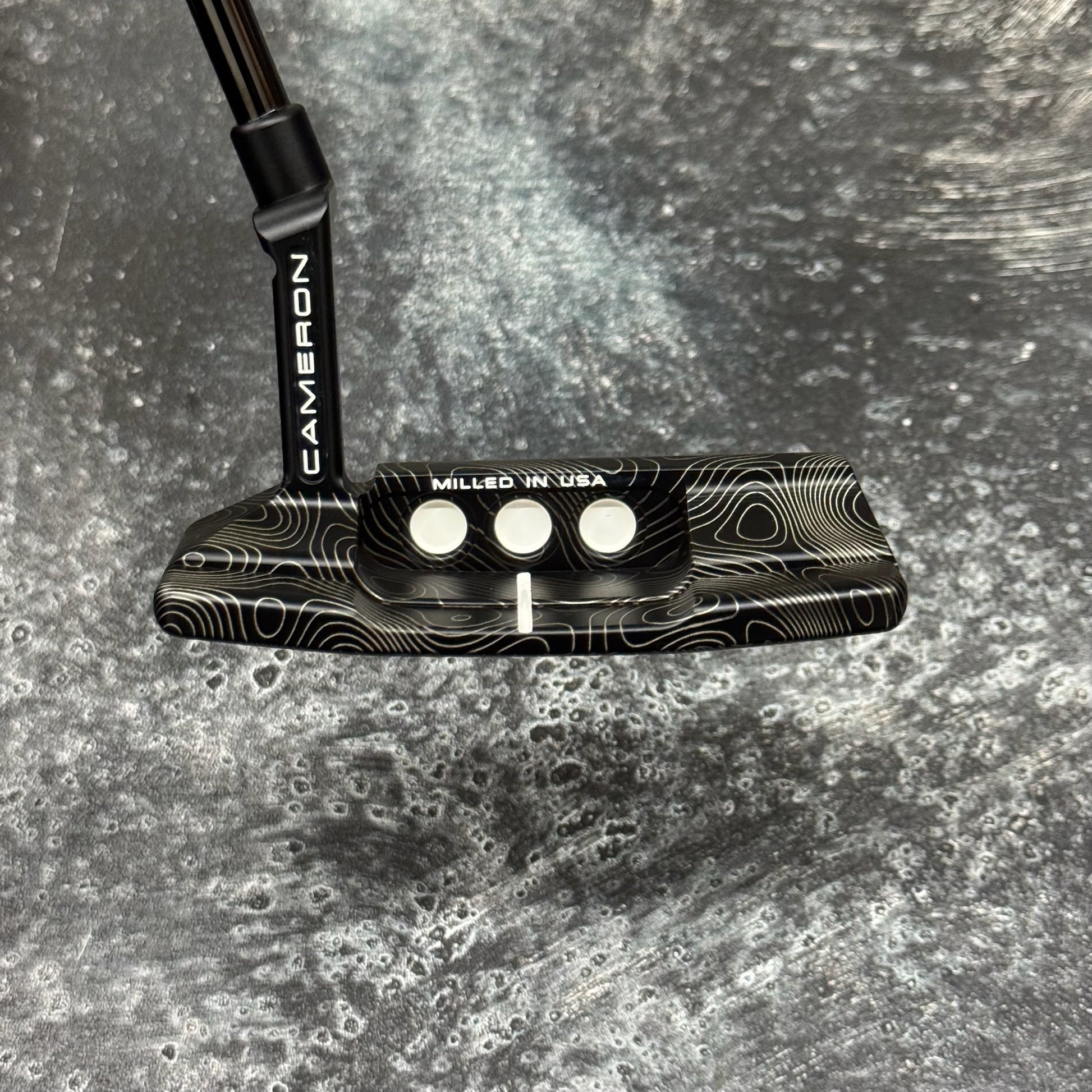 Scotty Cameron Super Select Newport 2+ in our Black PVD finish and Contour Print. Silver sole plate and Translucent Black Paint fill!