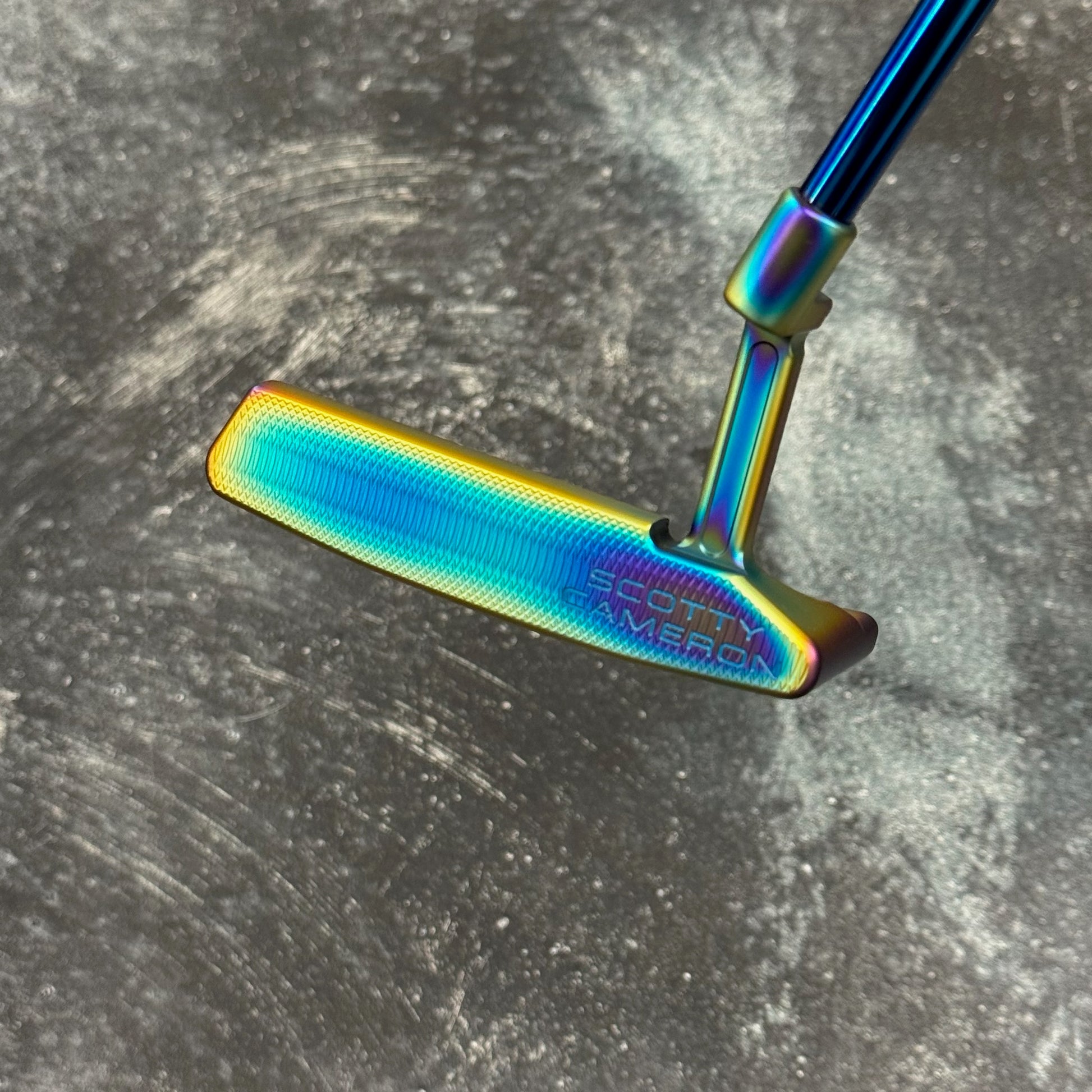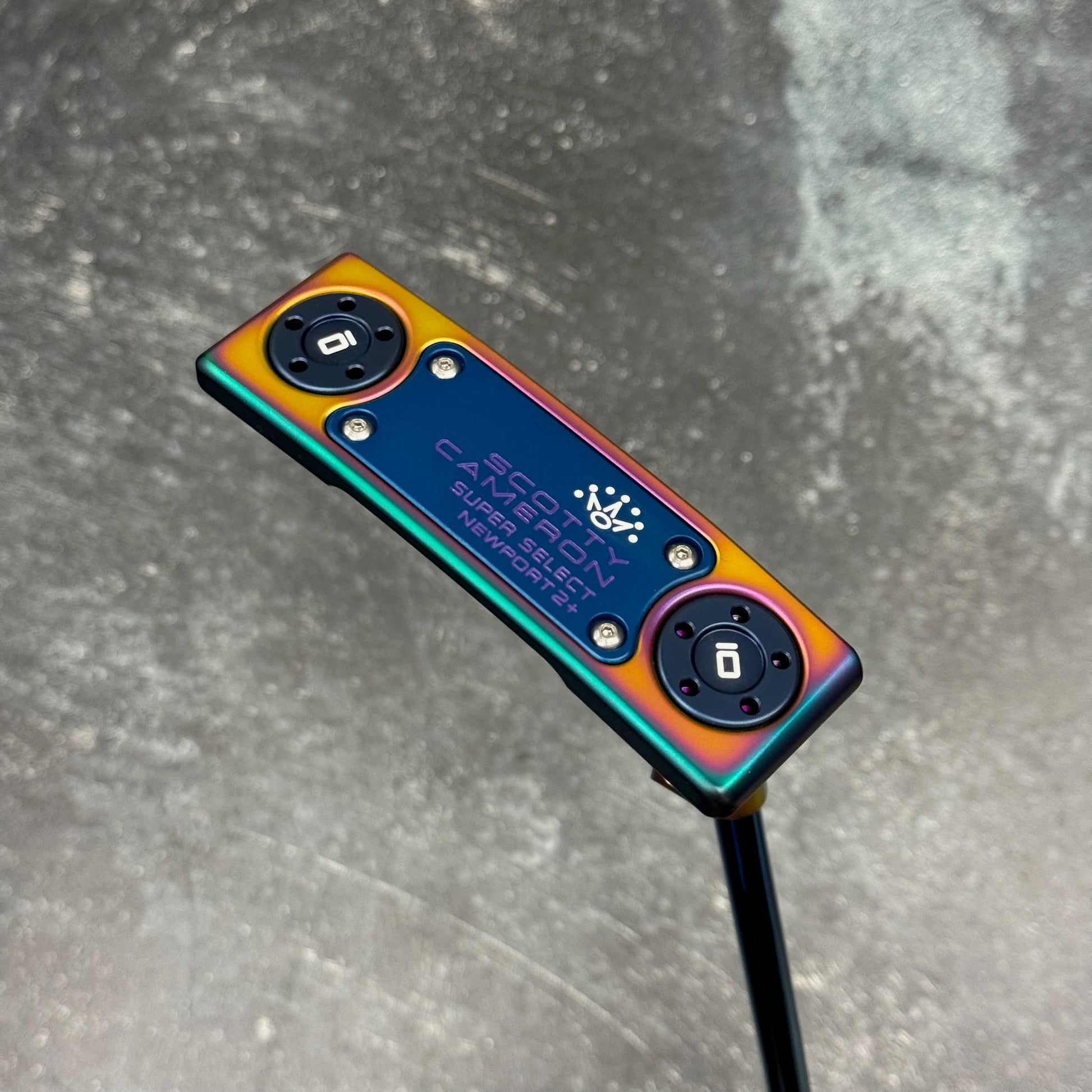 Scotty Cameron Super Select Newport 2+ finished in Crazy Rainbow PVD with a Blue Sole Plate and a Blue PVD shaft!